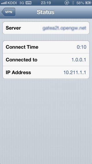 当 VPN 建立时,你可以看到状态屏幕上的状态和连接时间。您 VPN 的私人 IP 地址也显示出来。