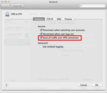 高级设置将出现。在 "Send all traffic over VPN connection"